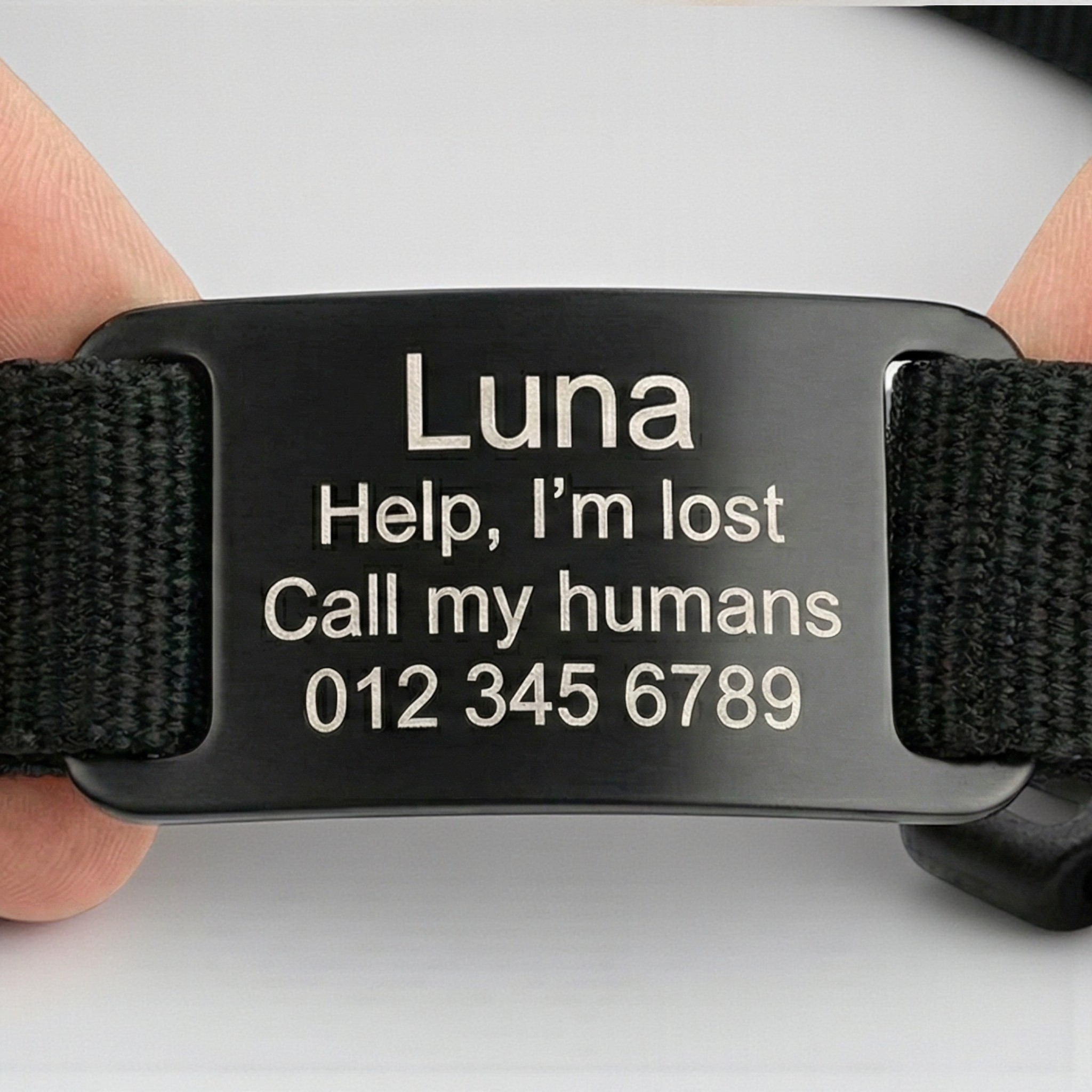 Важливо: Перевірте ширину вашого нашийника! Він має бути не ширше 19 мм, щоб пролізти в отвори. Адресник підходить для ремінців із класичною застібкою (як пояс), але не пролізе через пластикові фастекси (засувки), якщо вони незнімні.