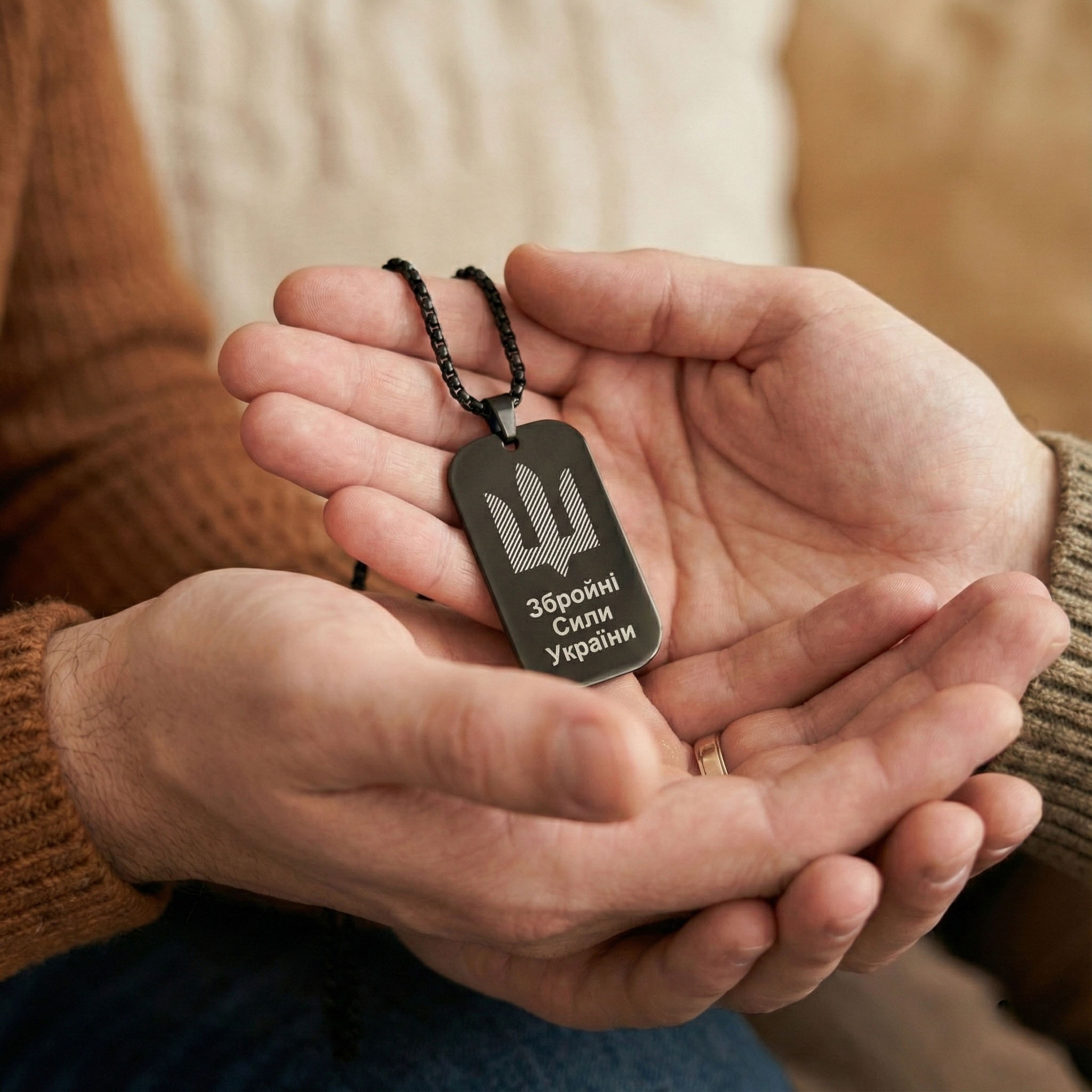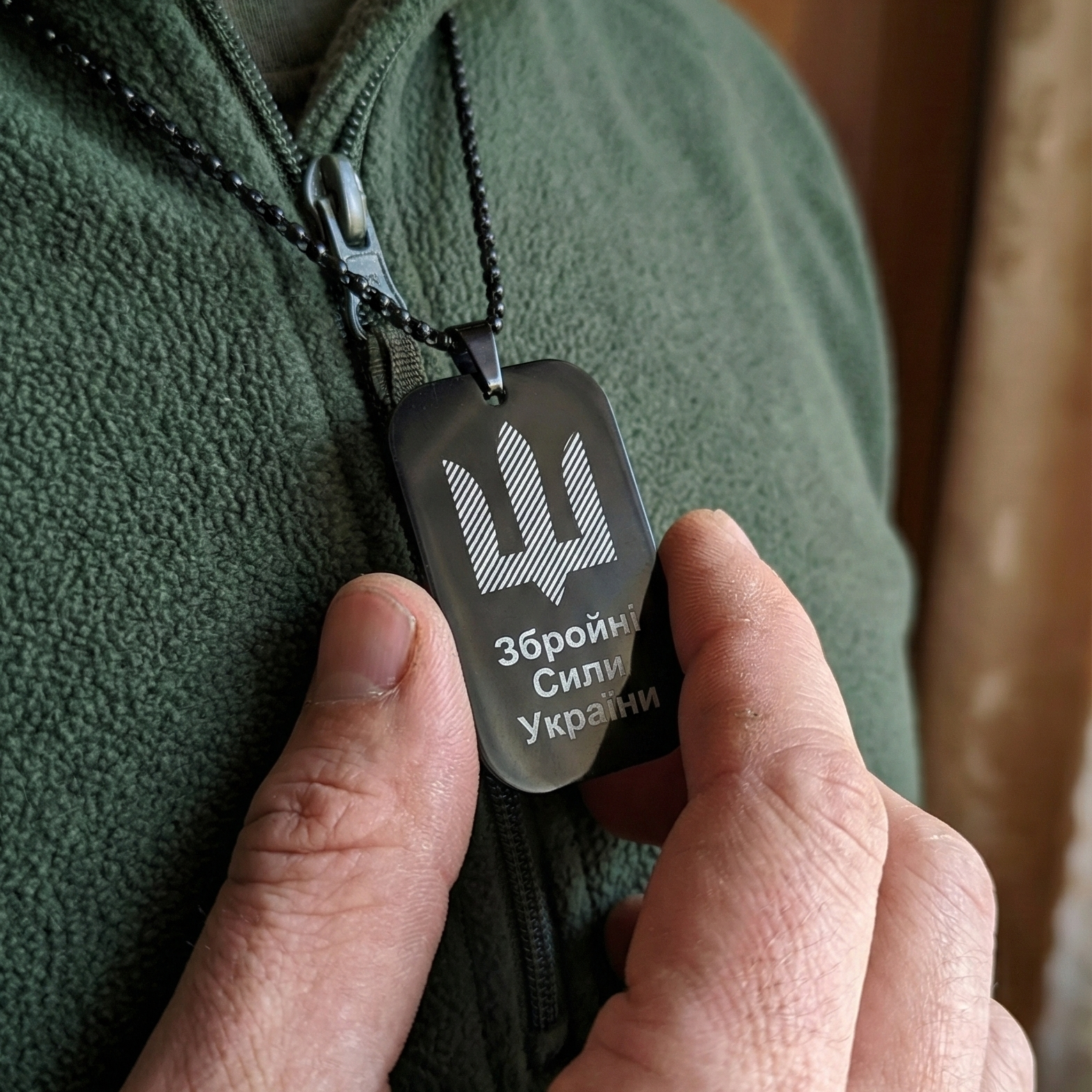 Готовий до використання У комплекті йде чорний ланцюжок довжиною 61.5 см. Жетон приємний на дотик, має заокруглені краї та комфортно відчувається на тілі під час носіння термобілизни чи фліски.