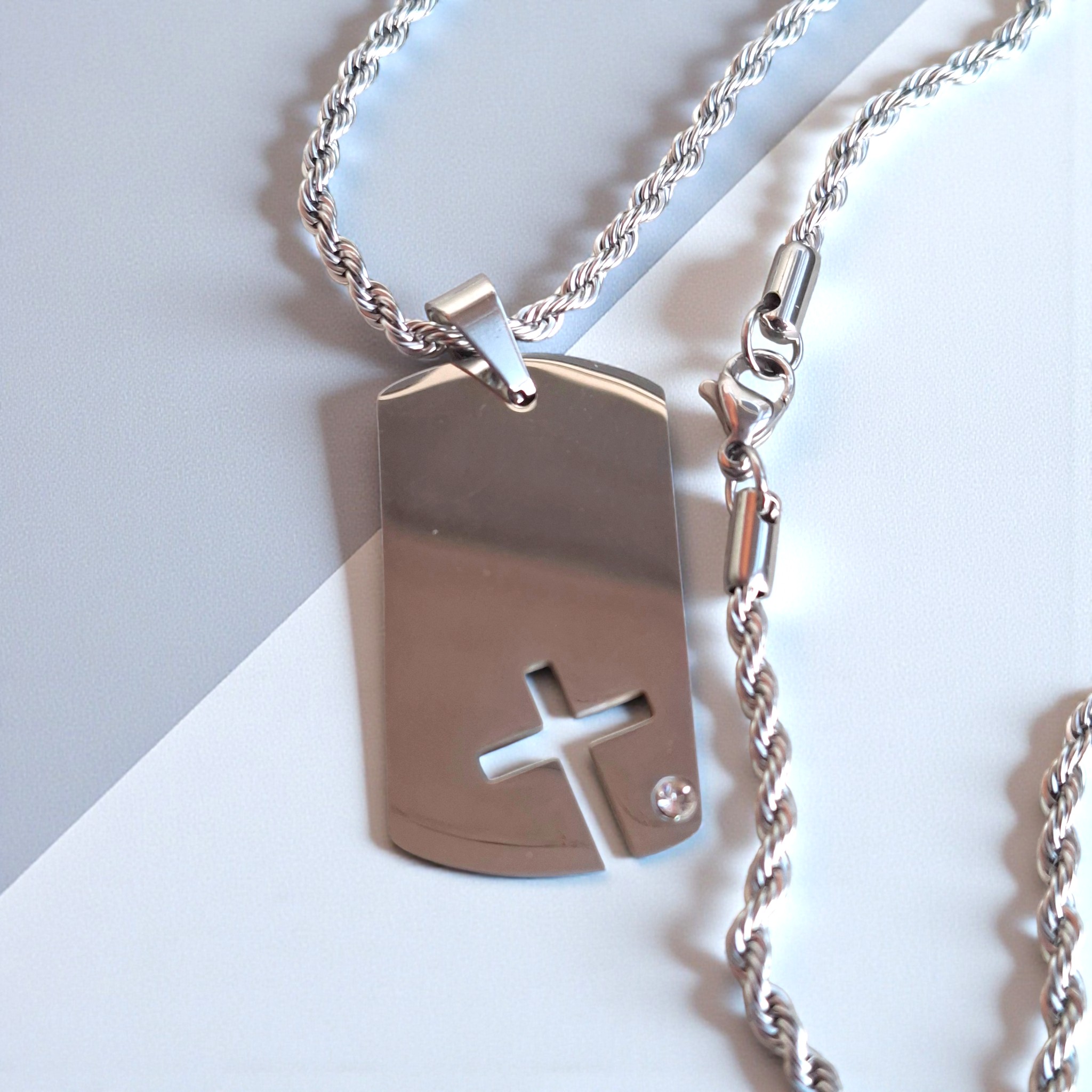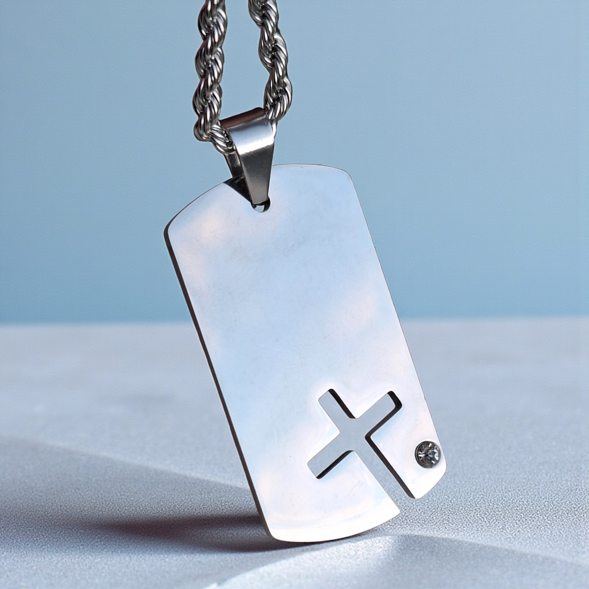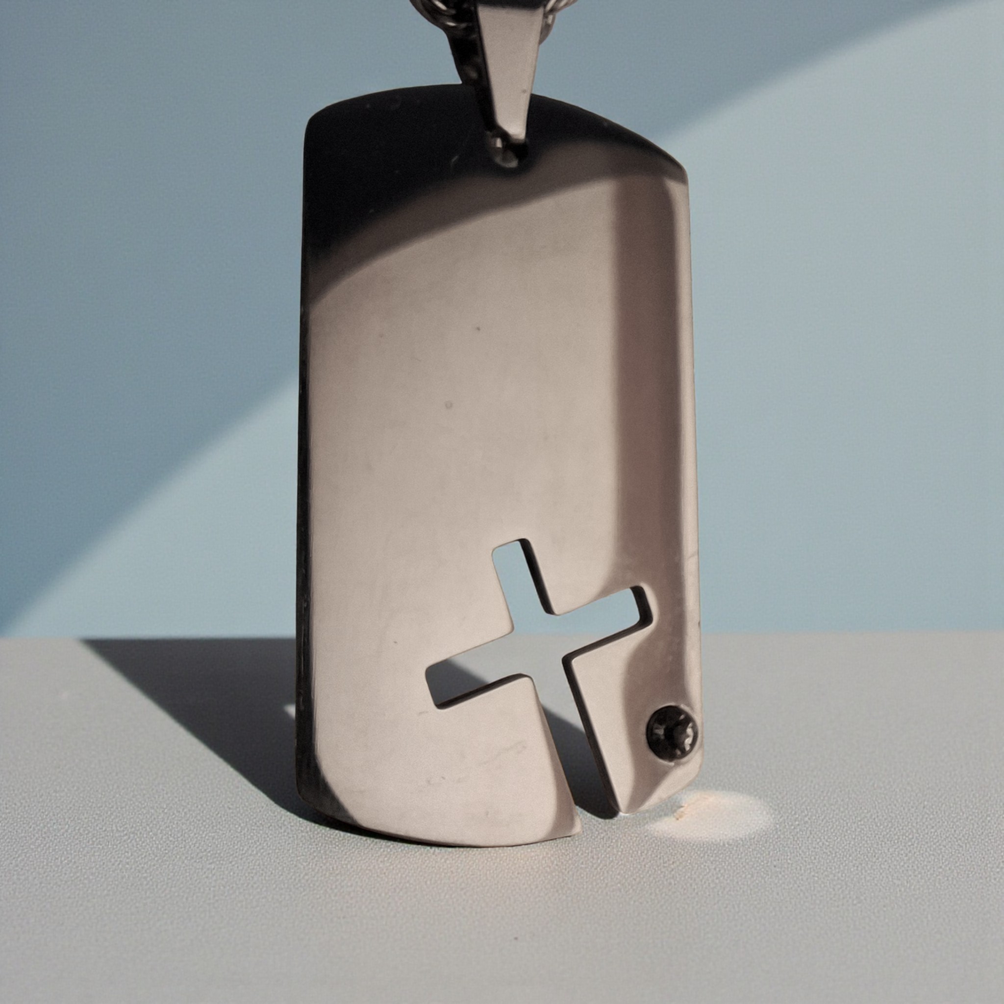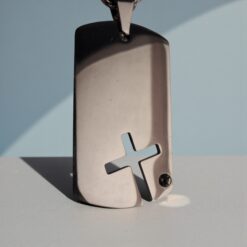 Поєднання холодної сталі та символу віри (хреста) створює образ сили та впевненості. Дизайн доповнено ледь помітним кристалом, що додає виробу завершеності, не порушуючи суворого чоловічого стилю.