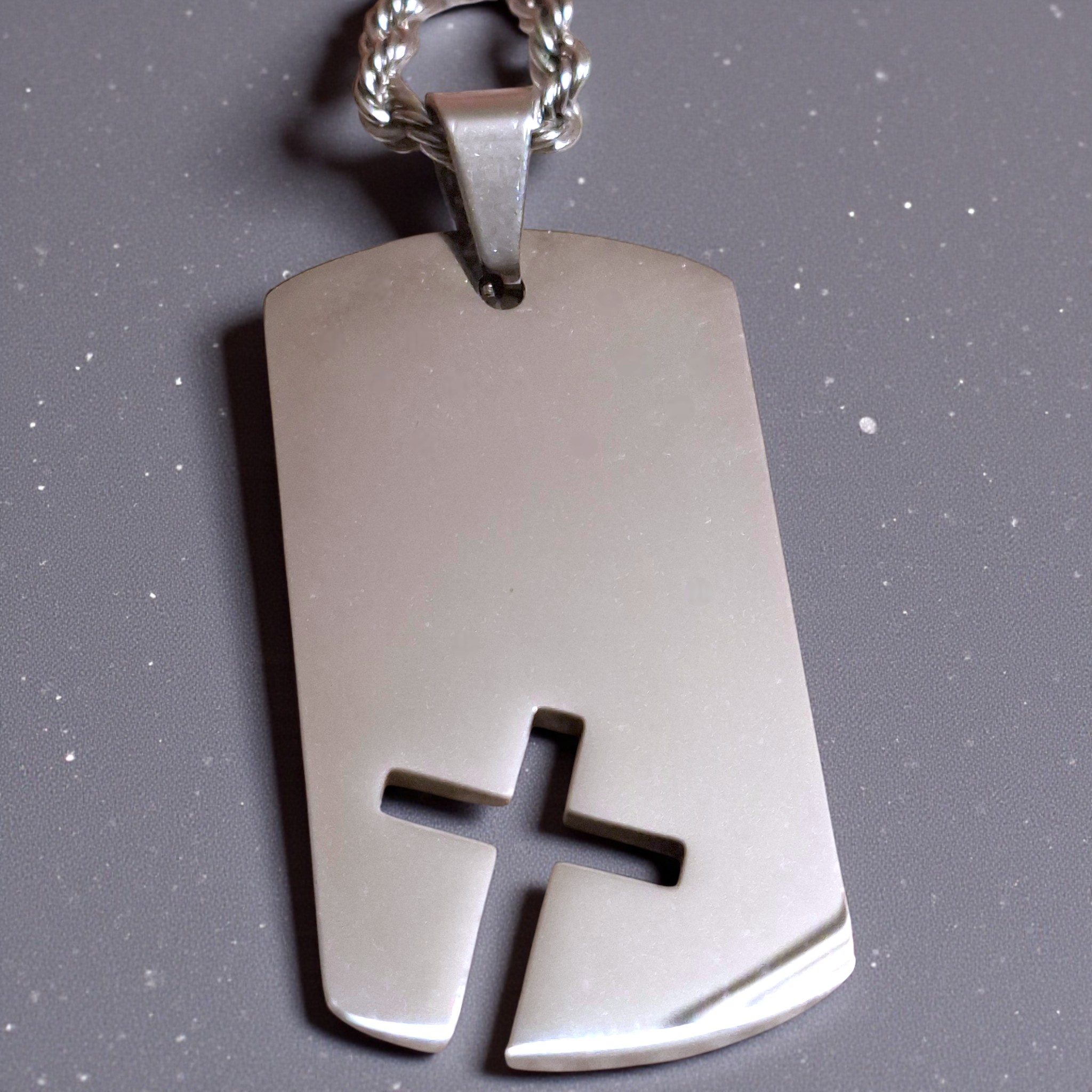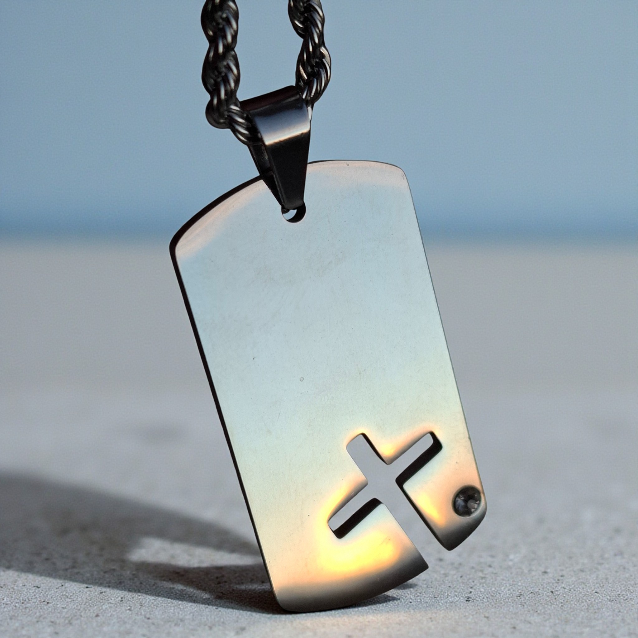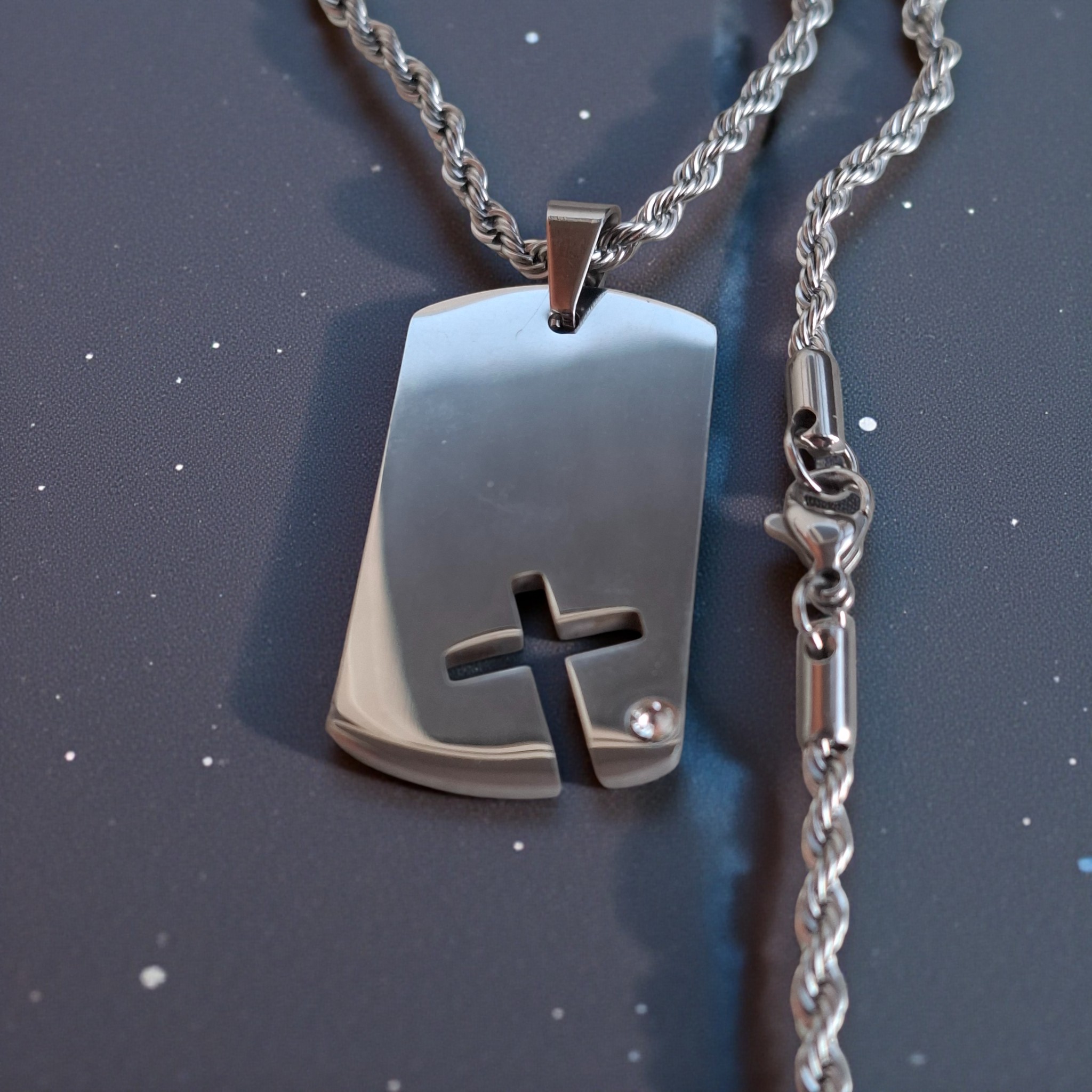 Поєднання холодної сталі та символу віри (хреста) створює образ сили та впевненості. Дизайн доповнено ледь помітним кристалом, що додає виробу завершеності, не порушуючи суворого чоловічого стилю.